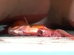 どんどん汚れていくストッキング、めいちゃんも自分で○魚をすくいあげて足元に置いていきます。飛び跳ねているのを容赦なく、というよりも楽にしてあげます。つま先や足裏全体、かかとで全体重をかけたりとバリエーションにとんだ様々な踏み方でCRUSH、最後は全部まとめてくちゃくちゃしています、可愛くピースサインまでしていますが足元の映像とは真反対の可愛いポーズでした。