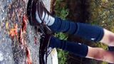 野外でローファーでザリガニ踏み踏み。可愛いねー、でも私に逆らってるの?もう、おやすみ。ベキッ、ローファーと地面に挟まれ、徐々にすり潰され地面の一部になるザリガニたち、またまためいちゃんは自分で踏んでいる風景を自撮りで撮影してました。自分のSNS用だと言ってました。ローファーで踏まれ、左右にねじりを加えるとアスファルトの威力はすごいです。